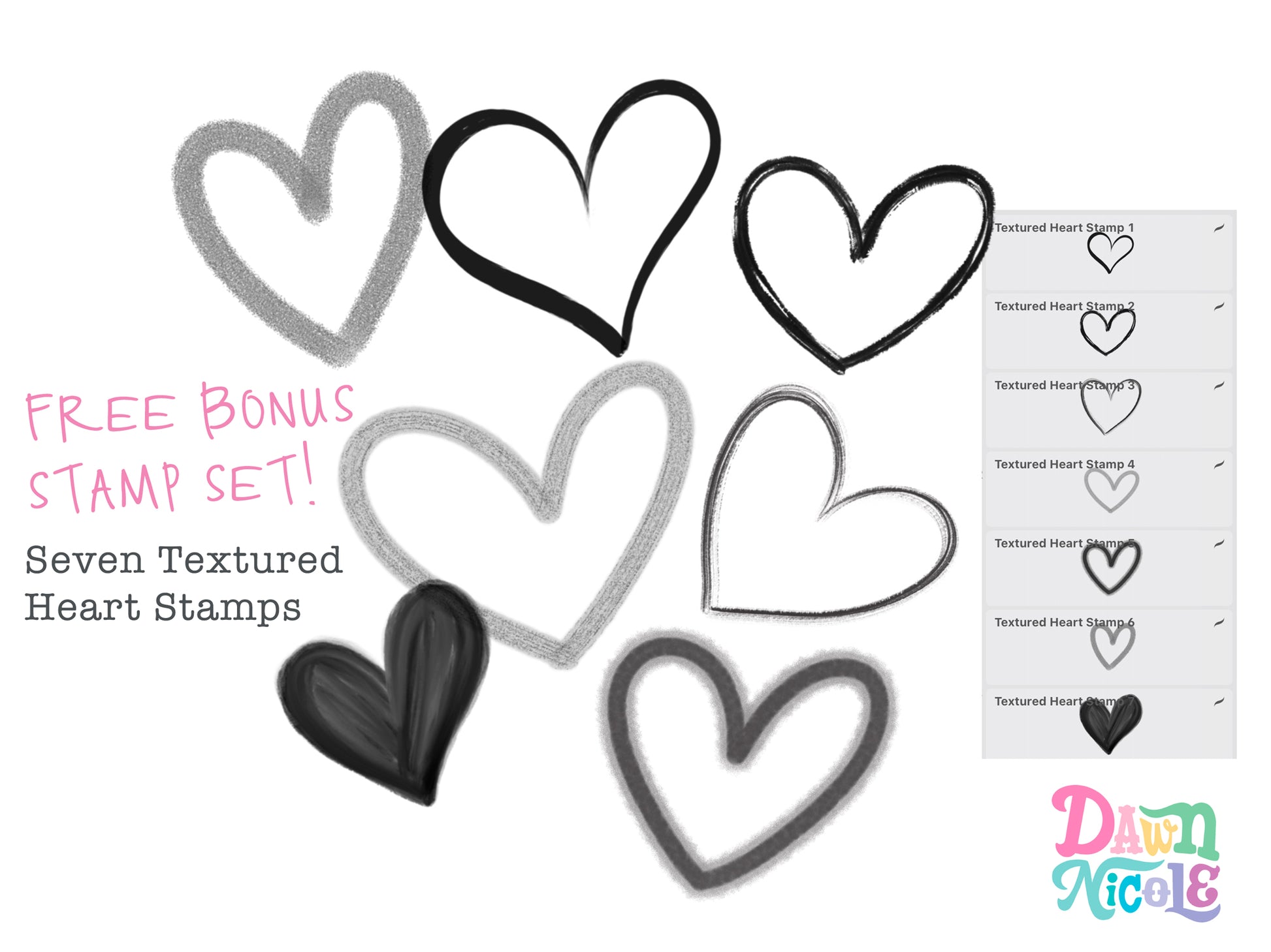 BONUS! You'll also receive a set of seven hand-drawn textured heart stamp brushes.