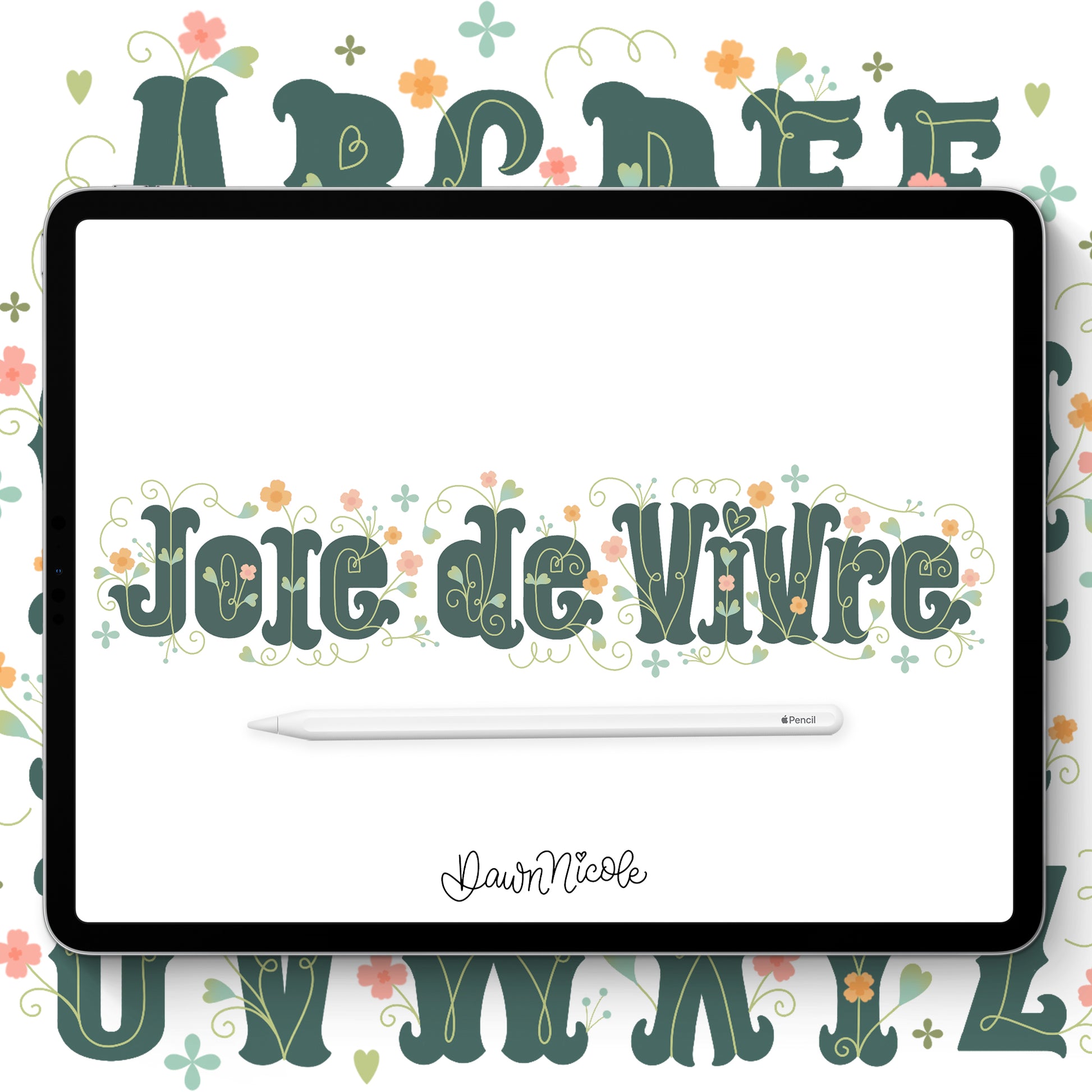 The Joie de Vivre Lettering Style workbook is a twelve-page PDF. The worksheets are also provided in a Procreate file for practicing on your iPad. The March Lettering Style Challenge worksheet is a five-page PDF file.