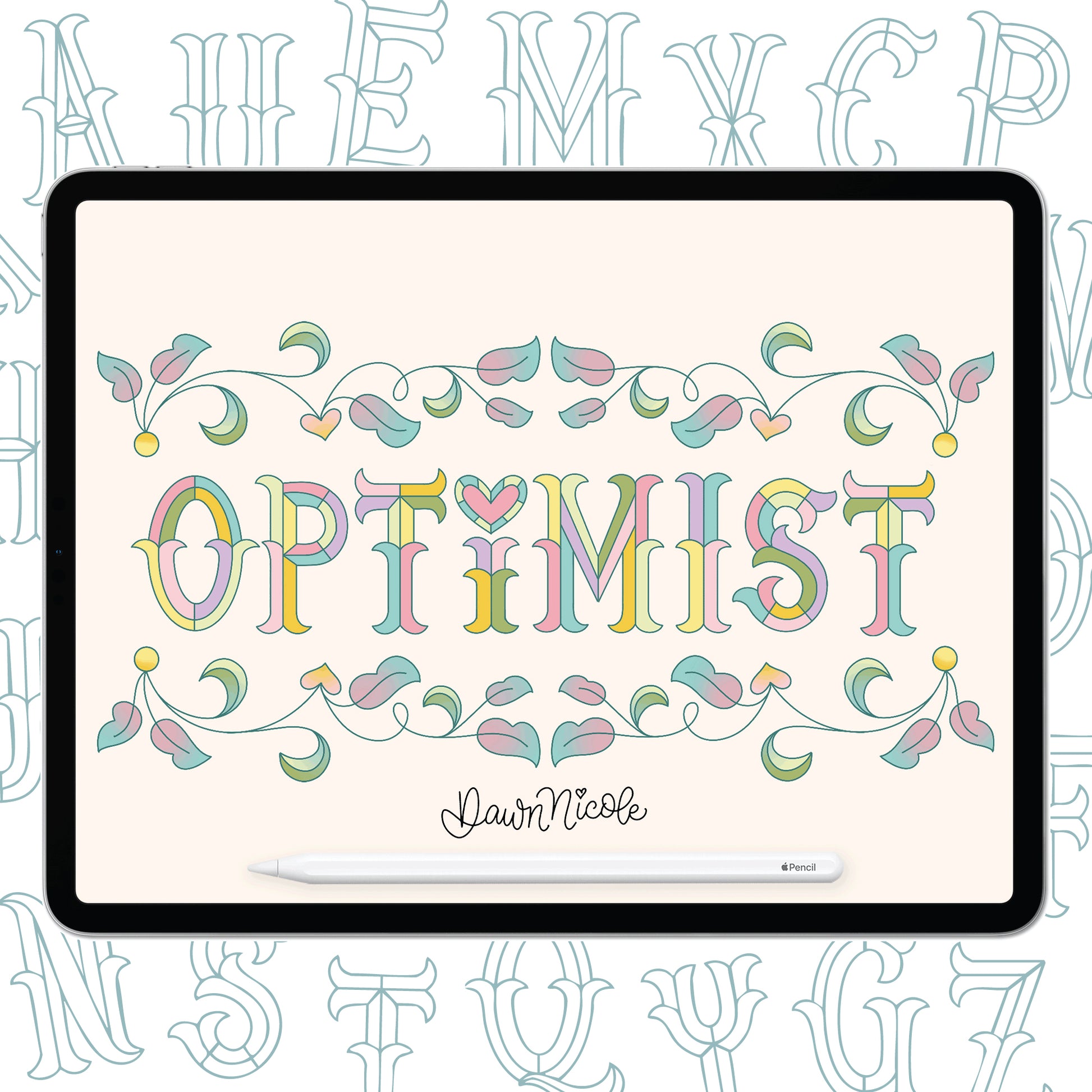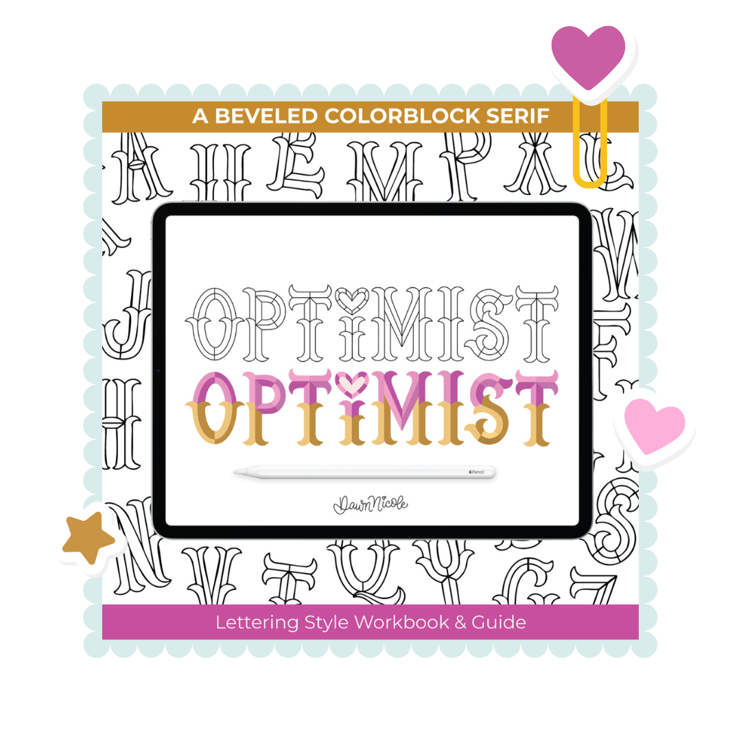 The Optimist Beveled Serif Lettering Style workbook is a twelve-page PDF. The worksheets are also provided in a Procreate file for practicing on your iPad. The January Lettering Style Challenge worksheet is a four-page PDF file.